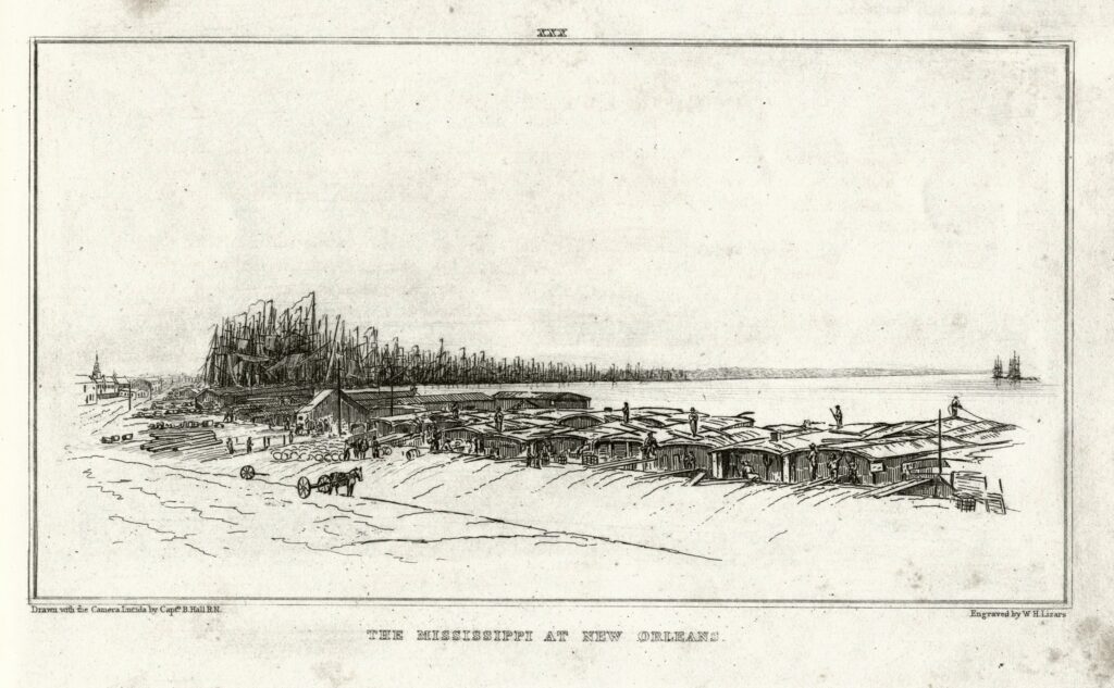 Today’s find…. the New Orleans riverside, drawn in 1828 by Captain B Hall, from the flatboat landing, looking downriver to the ocean-going tall ships. He drew this using a camera lucida. In effect, this is a tracing of what was really there. In another source, I find that, on May 20 1828, 68 ocean-going ships, 50 brigs, 10 schooners and 6 sloops lined the old city wharf, a forest of at least 300 masts. That’s what Cap’n Hall saw.