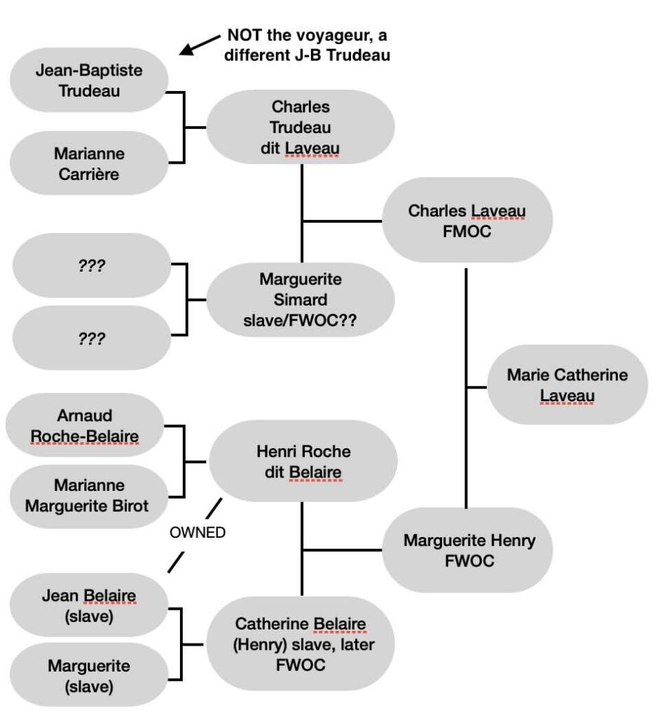 Marie’s mother was Marguerite Henry, the illegitimate daughter of Henri Roche dit Belaire, and Catherine, his slave. Marguerite, although born a slave, became a free woman of color.